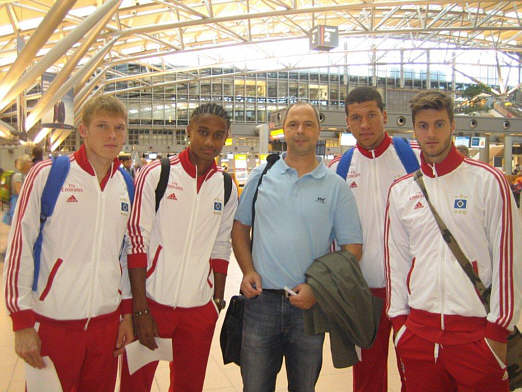 Nachdem wir uns am Flughafen zunächst orientiert hatten, wo die Mannschaft eincheckt, machten wir es uns gemütlich und beobachteten das Geschehen. Schon nach wenigen Minuten traf die Mannschaft mit Großraumtaxis ein. In der Eingangshalle wurden anschließend die Flugtickets verteilt.